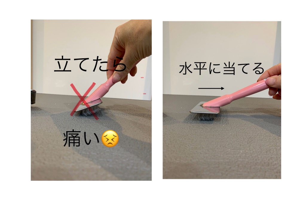次に使い方ですが、ブラシの遠くをそっともって、平行に動かすと良いです。弱い力でそっととかすことができます。立てると痛いのでご注意くださいませ!